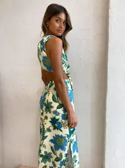 Tailored to fit and flatter, this sleeveless midi dress with a striking cut out waist and knot at shoulder and waist is crafted from a weight Linen fabrication in a tropical botanic print.