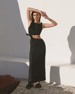 Crafted from a luxurious Linen, this sleeveless midi dress with a striking cut out waist and knot at shoulder and waist effortlessly flatters for any special occasion.