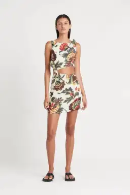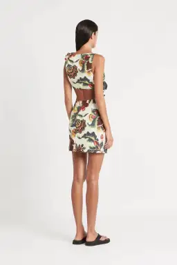 "A sleeveless mini dress cut in linen with a feature cut out at waist and a knotted tie at shoulder and waist in our exclusive Ambroise print."