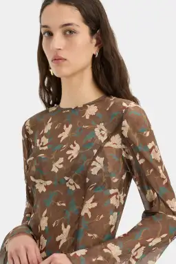 Cut on the bias, the Avellino Cascade Dress is a long sleeved, vintage-inspired feminine maxi length silhouette. Crafted from a sheer silk chiffon fabric in a SIR. Exclusive chocolate fore print, which has a timeless charm. Featuring fine laced panel lines and ruffled trims which create a flattering fit. Complemented by a sleeveless chocolate slip dress in a maxi length to be layered underneath. Pair back with boots or heels for your next special occasion.