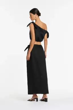 The Bettina Tie Midi Skirt & Crop is an everyday wardrobe essential crafted from a midweight linen fabric. The skirt features a mid-waist waistline with a tie detail at the hip and side split detail & the top features a cropped, elasticated hem and asymmetric neckline for a slight off shoulder finish.