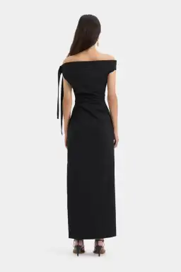 The Dahlia Gown in Black is a feminine event silhouette, featuring an asymmetric off-shoulder neckline with a tie detail on the shoulder for a statement finish. Designed for a flattering form-fitting silhouette, it is tailored with soft tucks through the body and cut from our signature Italian stretch cotton fabric.