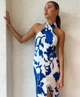 The Esme halter dress, a long line maxi dress with a halter neckline, crafted in 100% silk printed in our SIR. exclusive Merce abstract print. Features an open back, tie detail and centre front split.