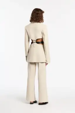 The Musee Contoured Blazer is a single breasted blazer, crafted from an Italian suiting fabric in a neutral ecru tone. Offering a structured silhouette with a fitted waist and cutout back with a custom SIR. Buckle for an added cool, unexpected detail. Style with a belt for an elevated look.