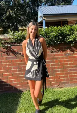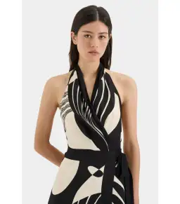 The Realisme Wrap Halter Mini is a modern shape, crafted from a naturally sourced silk crepe in the Papier print, an abstract monochrome print. Featuring a draped silhouette with a wrapped waist and an open back detail. Designed to be worn as both a mini dress or over a pant.