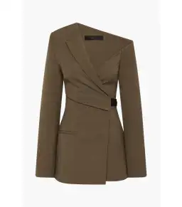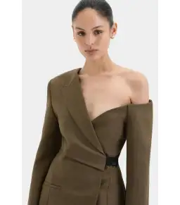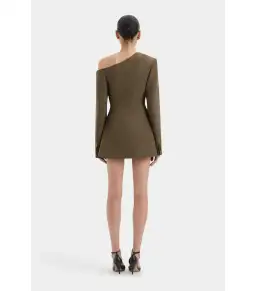 The Sartoria Mini Dress in Chocolate Marle is tailored in a smooth suiting fabrication with a marle texture and structured feel. Inspired by the silhouette of a blazer, it features an asymmetric off-shoulder neckline, punctuated waist and a functional wrap design with a contrast tab and button closure.
