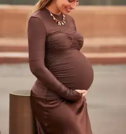 A best-selling silhouette reimagined in Chocolate, the Alessia Draped Gown is a long-sleeve, full length dress crafted from fluid viscose jersey layered with a lustrous satin finish. Offering a fitted bodice with an exposed bra detail and gathering throughout, draping into a relaxed narrow skirt with a split detail.
