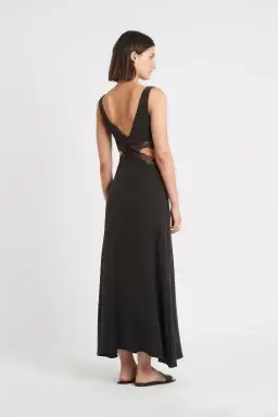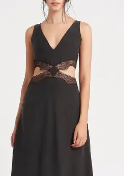 Crafted from a matte silk with cutouts at the waist trimmed with lace. The maxi dress is a sleeveless style with a soft v-neckline that also features at the back.
