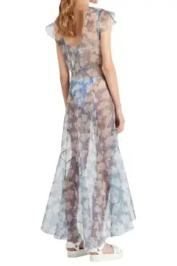 The Anais Low Back Gown in SIRs Resort Blue Anais Print is a sheer organza gown featuring cap sleeves and panelling details.