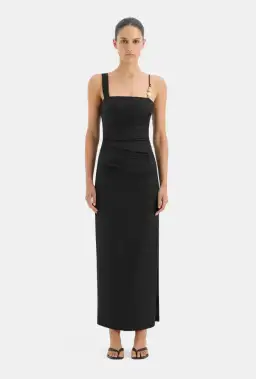 The Antonia Beaded Midi Dress in black is designed with asymmetric straps featuring stacked beads, a side split and tucks through the body, creating a flattering, feminine silhouette. Crafted from a mid weight linen fabric.Material: 100% linen