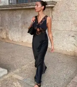 A black cut out maxi dress featuring contrast floral lace cut-out detail through front to accentuate the waist. Bias cut silk satin softly skims the body.