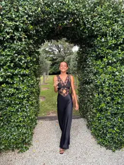 A black cut out maxi dress featuring contrast floral lace cut-out detail through front to accentuate the waist. Bias cut silk satin softly skims the body.