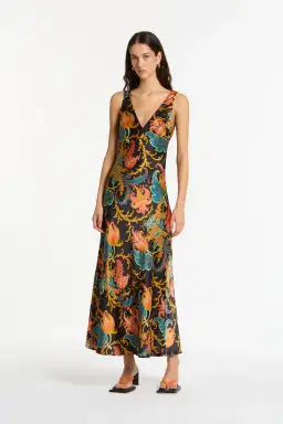 "The Artiste V Neck Slip Dress in our SIR. exclusive Deschamps print is an elevated maxi dress featuring a deep v neckline and low cut scoop back. Cut on the bias from a silk fabric, offering a relaxed draped silhouette."
