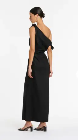 The Bettina off shoulder dress in black is a wardrobe staple, crafted from a midweight linen fabric. Featuring ruching through the waist for a flattering look, a side split and tie detail at the shoulder.