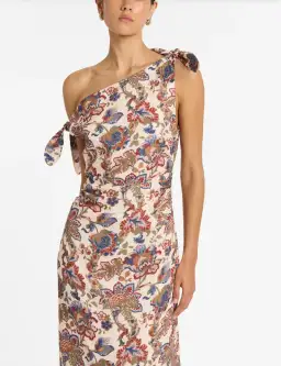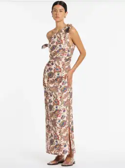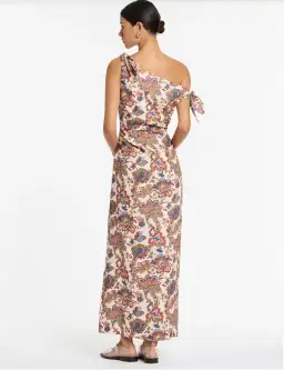 "The Bettina off shoulder dress is a feminine style crafted from a midweight linen fabric in our SIR. exclusive Wiltshire floral print. Featuring ruching through the waist for a flattering look, a side split and tie detail at the shoulder."
