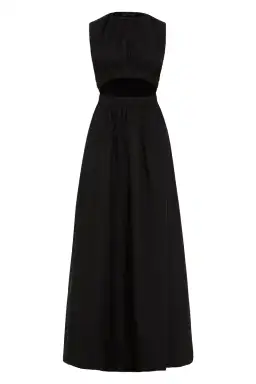 Sir The Label Black Dion Gathered Dress. Size 1 / 8 AU / 4 US. RRP $420. Maxi length. Round high neck. Sleeveless. Centre front cut out. Elasticated bodice hem and skirt waist. Side seam pockets. Lightweight, crisp cotton poplin. Lined. 100% cotton. Pullover.