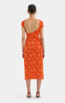 The Blanca Wrap Skirt in Palmera Tangerine is crafted from stretch burnout jersey with a textured floral motif. Designed to be worn high or low on the waist, it features a functional wrap design with side ties for a custom fit.