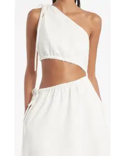 A one shoulder asymmetric gown cut in white linen. Bodice features a corded tie to adjust gathers at shoulder. The full skirt features an elastic waistband and corded tie drawstring.