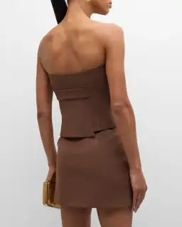 The Bromley Bodice in Chocolate is a fitted strapless silhouette, tailored in a midweight suiting fabrication. It features panel seams for a structured and tailored fit, a built-in belt detail with a button closure and a stepped hem for a modern finish.