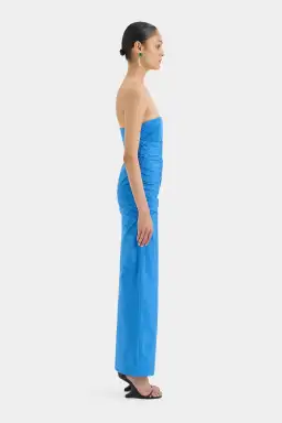 A strapless silhouette, featuring a U-shaped cutout at the bust with boning detail for a structured fit. Crafted from a crisp fabric with ruching through the body and a shiny finish, pair back with sculptural earrings.