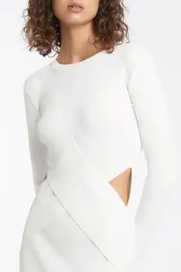Ivory rib long sleeve midi dress - featuring a cross over front to drape over waist and reveal cut outs at side.