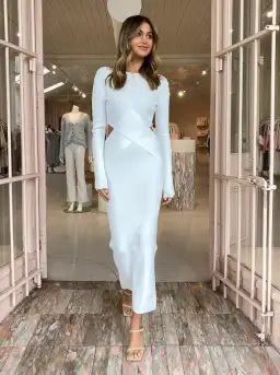 An ivory rib long sleeve midi dress featuring a cross over front to drape over waist and reveal cut outs at side.