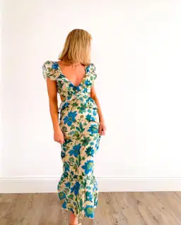A midi dress constructed in lightweight cotton / silk in our exclusive Marguerite print. Features cutouts through waist that are accentuated by delicate ruffles that carry through from shoulder. Open back is secured with tie.