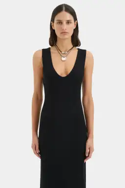 Cut from a textured bouclé knit fabrication with generous stretch. Designed to be fitted through the upper body, it features a deep scoop neckline, sleeveless design, and falls to a full length hem.