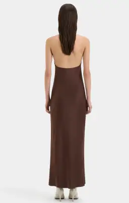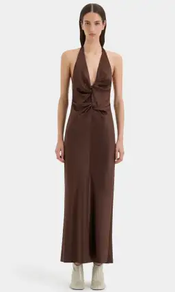 The Como Twist Dress is an elevated maxi length silhouette, crafted from a lustrous silk fabrication in Chocolate. Offering a halter neck design with a narrow fit through the body, featuring a cutout and twist detail at the chest. Pair with heels for your next special occasion.
