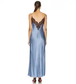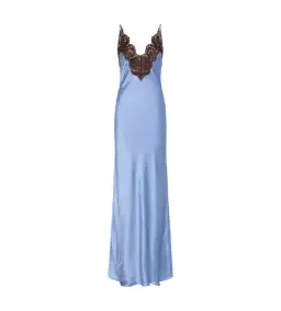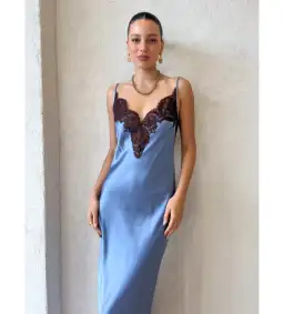 The Danseurs Lace Slip Dress in Blue is an elevated maxi dress, featuring a deep V neckline with contrast chocolate brown lace detail. Cut on the bias from a silk fabric, offering a draped silhouette that skims the body.