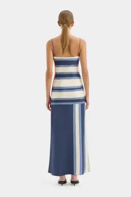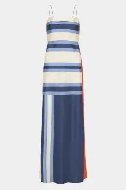A modern take on the classic slip dress, crafted from a luxe silk twill fabrication. It features a straight neckline, slender shoulder straps and a side split for easy wear. Patterned with constrasting geo stripes throughout and finished with a bold orange stripe detail at the side for a statement finish.