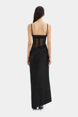 An occasion ready silhouette, crafted from lightweight silk with a lustrous satin finish. The bodice offers a shaped bralette detail and a lace panelled bodice for a sheer effect. The satin skirt softly drapes to form a feminine silhouette, defined by an asymmetric waist and a gathered side detail. Pair it with your favourite heels for your next event.