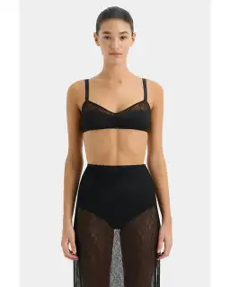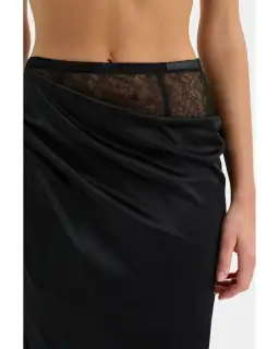 The Dunya Draped Skirt is a midi length silhouette crafted from lightweight silk in black with a lustrous satin finish. The removable satin overlay is softly gathered at the side to form a draped effect and finished with side split detail. Defined with a sheer lace underlay that is designed to be worn underneath or alone for versatile styling. It styles perfectly with the matching Dunya Bralette and the Strobe Cowl Top