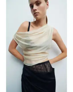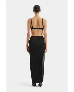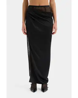 The Dunya Draped Skirt is a midi length silhouette crafted from lightweight silk in black with a lustrous satin finish. The removable satin overlay is softly gathered at the side to form a draped effect and finished with side split detail. Defined with a sheer lace underlay that is designed to be worn underneath or alone for versatile styling. It styles perfectly with the matching Dunya Bralette and the Strobe Cowl Top