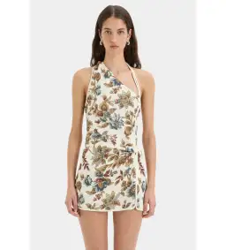 The Eleanora Asymmetric Mini Dress is a modern silhouette, designed with an asymmetric neckline and knotted detail at the hip. Crafted from a linen fabric in the SIR exclusive Viola print, drawing inspiration from palazzo wallpapers and intricate filigree florals. Pair back with sandals for an elevated look.