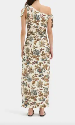 The Eleanora Tie Shoulder Dress is a repeat of our best selling Bettina Off Shoulder Dress. Crafted from a linen fabric in the SIR exclusive Viola print, drawing inspiration from palazzo wallpapers and intricate filigree florals. Featuring ruching through the waist for a flattering look, a side split and tie detail at the shoulder.