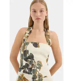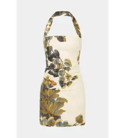 The Evalita Halter Mini Dress in Pine Valley is a feminine mini dress is crafted from a lightweight linen fabric inspired by autumnal foliage with painterly leaves. It features a halter neck design and tucks through the body for a flattering fit.