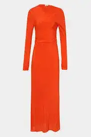 The Fresca Gathered Midi Dress in Tangerine is a bias cut silhouette, crafted from lightweight silk crepe de chine with a matte finish. It features a high neckline, relaxed full length sleeves and tucks through the shoulder and waist for a gathered finish.