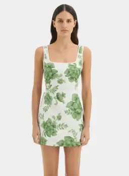 Mini lengthSquare necklineContrast bind along neck edgeCut out at side waist with adjustable drawstringMidweight natural fibre linen with luxurious hand feelExclusive SIR. printInvisible zipper at sideFully linedNo stretchTrue to size