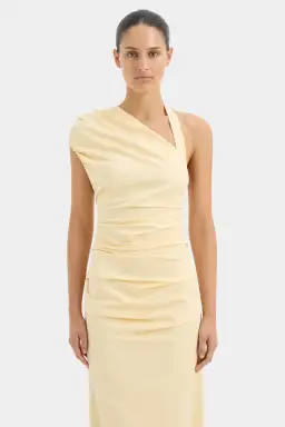 The Giacomo Gathered Gown in butter is a form fitting dress, featuring structured gathering, an asymmetric neckline and open back detail with a split hem.