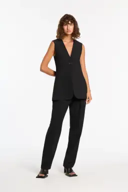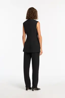 The Leni Structured Vest in black is a sleeveless tailored jacket, crafted from an Italian wool fabric. Offering a long-line fit with a v neck design, curved hem, darts to give it structure and a single button at the front