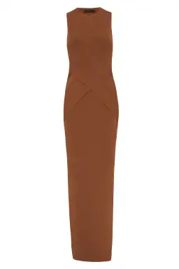 Sir The Label Hazel Josephine Sleeveless Dress. Ribbed knit. High neckline. Cross over front. Cut out at sides. Slips on. Bodycon fit. Heavyweight stretch knit. 85% rayon; 15% lycra.