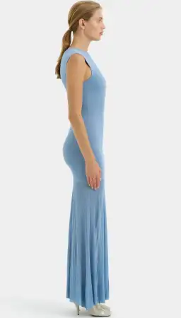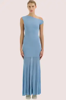 The Indigo Twist Dress in Blue is an event-ready silhouette, crafted from a compact knit fabrication that is designed for a form-fitting and contoured fit. It features an asymmetric neckline with a twisted off-shoulder strap, and a pleated maxi skirt with a sheer finish.