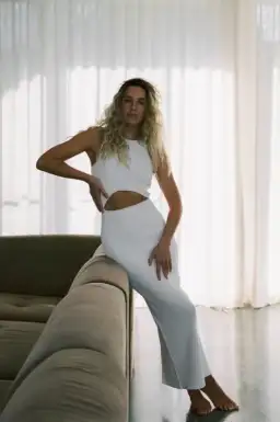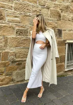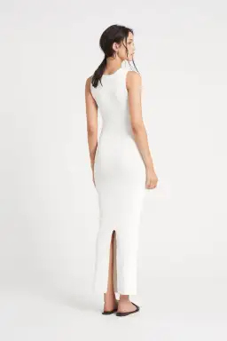 A compact knit white midi dress with cut out at waist and high center back split. Dress is designed to be reversible.