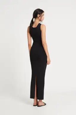 A compact knit midi dress with cut out at waist and high centre back split. Dress is designed to be reversible.