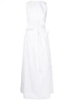 RRP $420. Maxi length. Round high neck. Sleeveless. Centre front cut out. Elasticated bodice hem and skirt waist. Side seam pockets. Lightweight, crisp cotton poplin. Lined. 100% cotton. Pullover.
