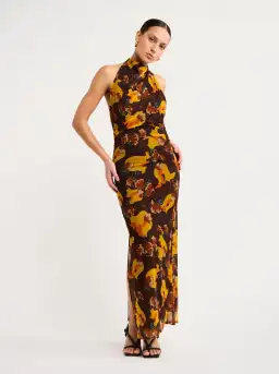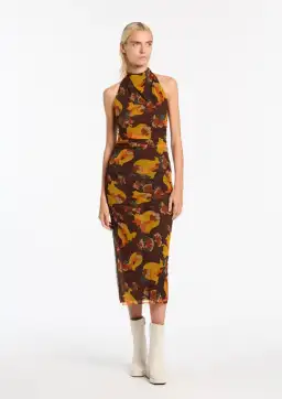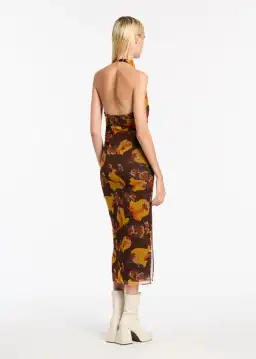 The Jacques Mesh Halter Midi Dress is a timeless silhouette, crafted from a mesh fabric with a slightly sheer finish in the SIR. Exclusive Expressionist print. Offering a fitted shape, featuring an open back, high neck design with a button closure and gathering through the waist.