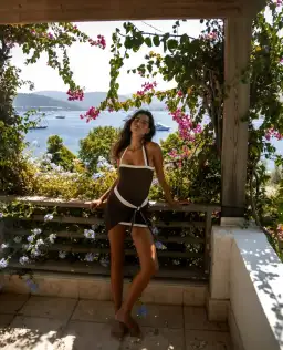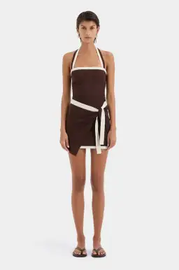 The Jacques Mini Dress in Chocolate is a fitted mini silhouette crafted from SIR. signature stretch mesh, layered for a more opaque look. It features a straight neckline with a halter strap and skirt overlay with an adjustable tie at the waist.