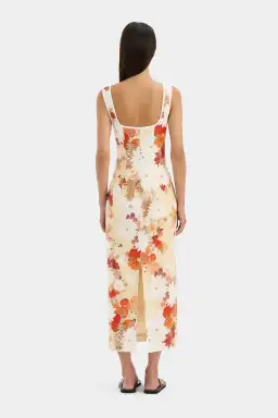 The Jessamine Midi Dress in Posy Floral is cut from our signature midweight linen, patterned with autumnal floral motifs throughout. Designed for a close fit, it features a square neckline, shaping darts for a structured fit and a side split for ease of wear.