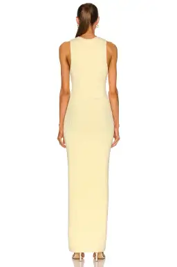 A lemon rib sleeveless midi dress featuring a cross over front to drape over waist and reveal cut outs at side. Kelvin features fully fashioned ribbed knit fabric in lemon and black. Twist details and off the shoulder features are met with classic shapes. RRP